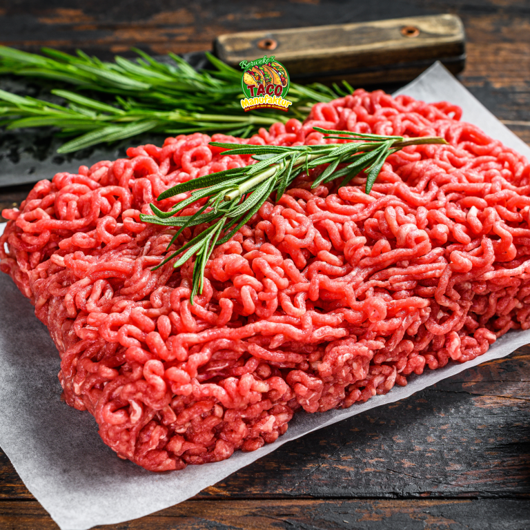 WIR VERWENDEN AUSSCHLIEẞUCH 100% REINES RINDERHACKFLEISCH AUS KONTROLLIERTER HALTUNG FÜR UNSERE HANDGEMACHTEN TACOS, WELCHES AUS ZERIFITIERTEN FLEISCHEREIBETRIEBEN STAMMT.