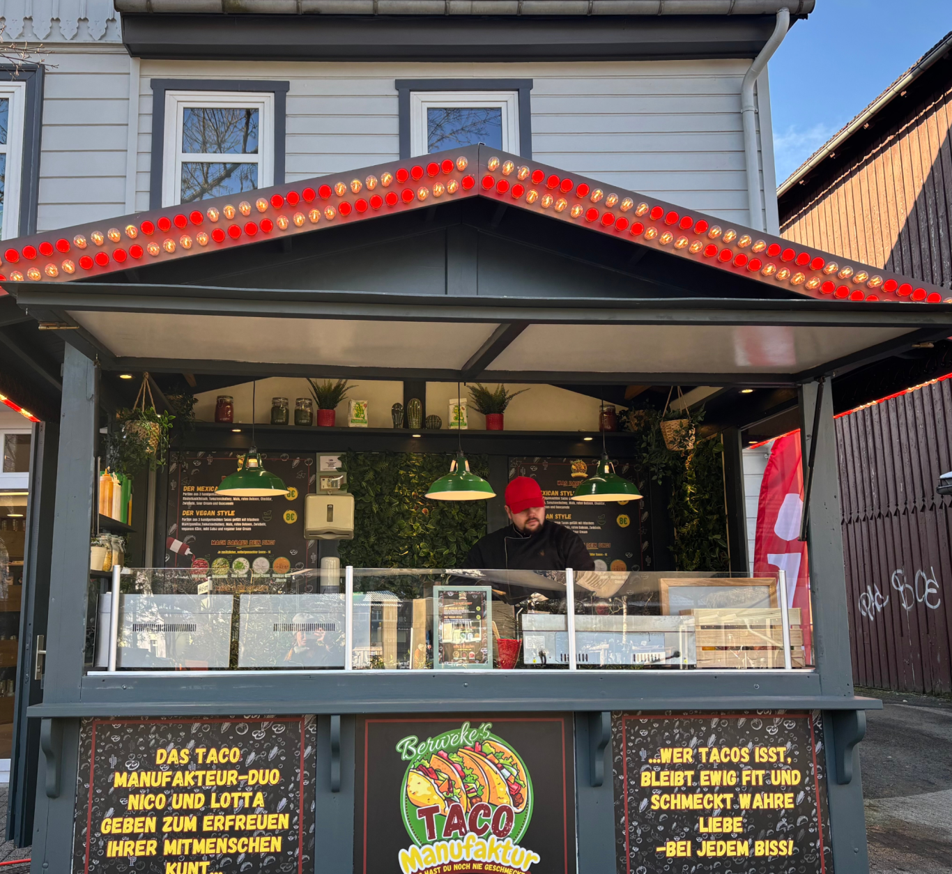 Willkommen bei der Berweke`s Taco Manufaktur – deinem modernen Streetfood-Spot mit Herz, Stil und Charakter. Unsere Hütte ist mehr als nur ein Verkaufsstand: Sie ist ein Erlebnis. Durchflutet von LED-Licht, gestaltet mit natürlichen Materialien, lebendigen Farben und üppigem Pflanzenschmuck, schaffen wir eine harmonische Atmosphäre, die ins Auge fällt und zum Verweilen einlädt.